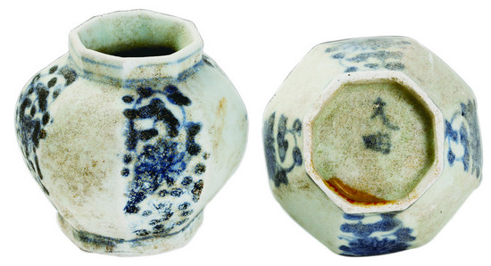 青花團菊紋八棱小罐