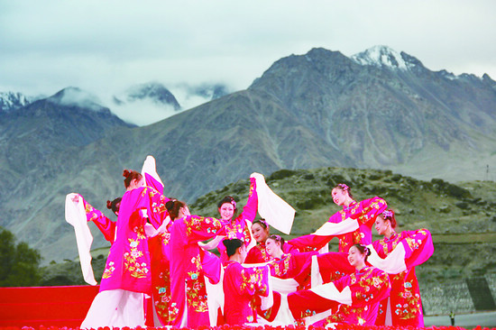 海拔3000多米的塔什庫爾干縣阿拉爾金草灘演藝廣場,背靠著疊巒起伏、云霧繚繞的群山,成為天然的舞臺背景,觀眾沉浸在與美麗的風(fēng)光融為一體的美輪美奐的演出當(dāng)中,下雨了也渾然不覺……