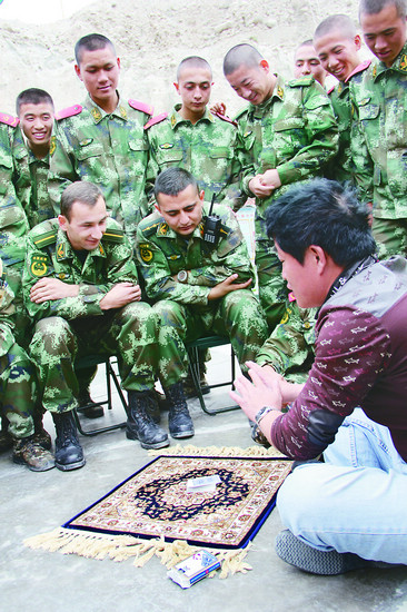 魔術(shù)師李學(xué)義在蓋孜邊檢站近距離給官兵們變魔術(shù)
