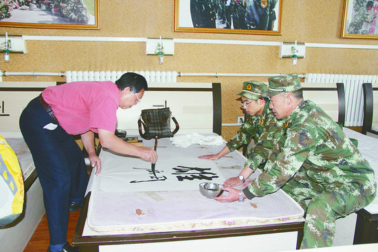 沒有桌子,書法家王獻(xiàn)坤在紅其拉甫哨所營房內(nèi)的床鋪上創(chuàng)作