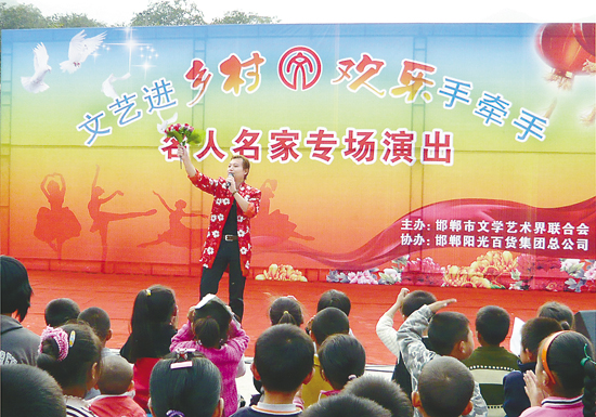 2010年6月,邯鄲市文聯招募400名文藝志愿者,成立了“邯鄲市名人名家藝術團”。全體團員實行簽約制,無論是年逾古稀的老藝術家,還是“80后”的文藝新秀,都自愿無償為群眾表演和創作。建團以來,藝術團堅持深入到農村、學校、軍營、社區、工地、機關演出,把舞臺搭在偏遠的農村、搭進田間地頭,讓老百姓在家門口就能看到高水平的表演。團里的著名書法家、美術家們還現場為農民免費書寫、繪畫,對他們的業余創作進行現場指導。截至目前,邯鄲市名人名家藝術團已演出40余場、節目800余個,參與演出人員1000余人,創作奉送書畫作品2000余幅。