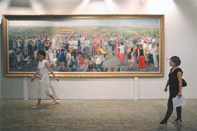 此次主題創作活動歷時一年多,收到了700余件作品。值得一提的是,參與畫家不僅有土生土長的北京人,也有來自外地的畫家。如巨幅油畫《景山放歌》的作者何紹教,他為了收集繪畫素材,多次從杭州來北京。在某天早上,他爬到景山公園眺望紫禁城全景時,看到晨起鍛煉的老人,唱合唱的婦女,拿相機的游客,瞬間產生了靈感,“這幾天我在北京見到的生動場面一下子就被串聯起來”,何紹教說,他回到杭州后立馬就根據內心感受作了一幅長卷。之后他又多次奔赴北京天壇公園、玉淵潭公園,獲取了豐富的人物素材,耗時半年多完成了這幅《景山放歌》。