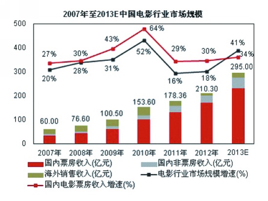2007年至2013E中國(guó)電影行業(yè)市場(chǎng)規(guī)模 圖片來源:CVResearch投中研究院