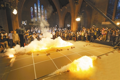 昨日記者現場看到,蔡國強先開始作畫,并鋪好火藥。下午5點半,在一切準備就緒后,蔡國強開始點火。在短短的7秒左右,巨大的爆破聲中濃煙彌漫新天安堂,7.44米×2.42米的火藥畫《故鄉》也隨之完成。