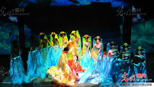 10月5日,《日月大明宮》演出現場。當日,國內首部多媒體動態藝術空間體驗秀《日月大明宮》在西安大明宮國家遺址公園演出。《日月大明宮》演出全長25分鐘,分為水、色、墨三幕,由北京奧運會開閉幕式導演組主任胡巨英任總策劃,著名舞劇導演梁群任總導演,顛覆了傳統舞臺的表現形態,利用創新性的高新數字影像技術,讓游客在動態互動影像中感受盛唐遺風。“十一”假日期間,游客只要持公園門票即能免費欣賞到這場演出。 張灜兮攝/光明圖片