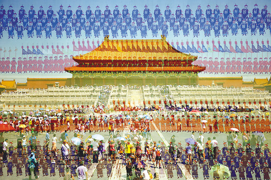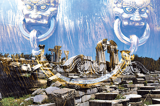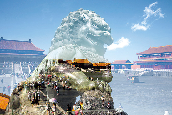 《尚書》有句云“經(jīng)天緯地曰文,照臨四方曰明”,文明一詞已有界定。《說(shuō)文解字》有釋曰“文,錯(cuò)畫也,象交文”。建川多用中、大畫幅膠片疊印積累的影像,營(yíng)造出交錯(cuò)幻生的畫面,是謂文也。“化”意為變易,衍生,改造,即“萬(wàn)物化生”。《京城記憶》不是單純的寫生觀照,特殊的技術(shù)方法是觀念意象的語(yǔ)言保障,文明與文化的圖像解釋。