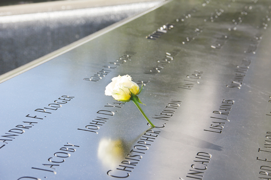 水池外圍刻著近3000名“9·11”罹難者的姓名,他們中年齡最大者為85歲,最小者僅兩歲,其中400余人是因履行職責而喪生的現場救援人員。這些名字按照“有意義的毗鄰關系”排列,反映罹難者在事件中身處何處以及他們與其他罹難者的關系。