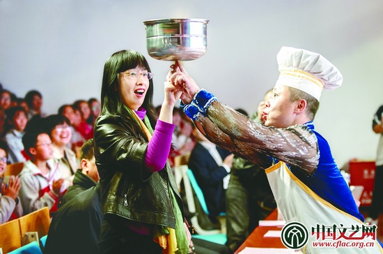 10月24日,由北京市文聯(lián)主辦,北京雜技家協(xié)會承辦的“讓藝術(shù)為中國夢插上騰飛的翅膀——首都藝術(shù)家走基層系列演出”在北京二中亦莊學(xué)校上演。首都文藝工作者表演了歌曲、魔術(shù)、雜技、啞劇等形式多樣的節(jié)目,受到師生們的歡迎。圖為雜技演員在演出中與觀眾互動。