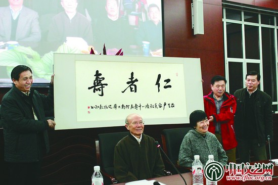 在“慶賀嚴家炎先生八十華誕暨學術思想研討會”上,嚴家炎先生(前排左一)與夫人合影。后排左一為本文作者。