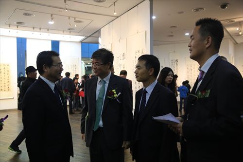 韓國駐華公使兼韓國文化院院長金辰坤,中國人民大學(xué)副校長劉向兵,全國政協(xié)委員、國家行政學(xué)院副院長周文彰、中國書法家協(xié)會理事朱守道、丁謙、楊廣馨,中國人民大學(xué)藝術(shù)學(xué)院執(zhí)行院長徐唯辛、藝術(shù)學(xué)院黨委書記兼副院長鄭曉華、副書記別敏、藝術(shù)學(xué)院文化藝術(shù)策劃研究所所長祝東平、副所長王鵬及中韓書法家代表、藝術(shù)學(xué)院師生、韓國留學(xué)生和媒體代表約200人參加了開幕式。金辰坤、劉向兵、鄭曉華等暢談了此次展覽對于中韓文化交流的意義。