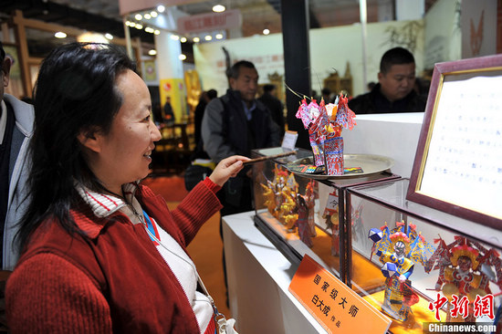 11月7日,第八屆北京文博會在北京國際展覽中心正式開幕。本屆文博會以“促進文化貿易 加快經濟升級”為主題,安排了六大系列100余場活動,設置16個主題展區,1800多家來自國內外的文化創意企業參展。圖為觀眾體驗傳統手工藝作品。中新網記者 金碩 攝