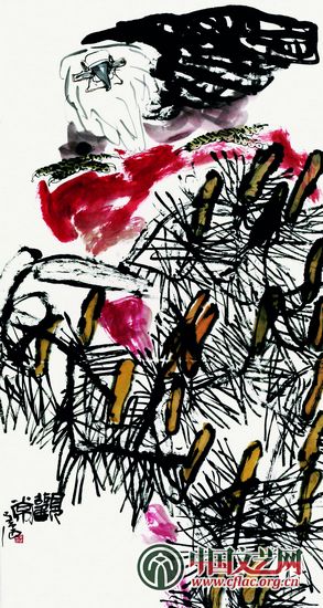 刁呈健先生寫意畫的創新是全面的,有現代構成主義介入的構圖,精彩的色彩駕馭,功能發揮到極致的線條和可讀的、可溝通的變體造型。他主體強大的功能完全能為他所描繪的客觀世界進行強有力的改造和提升,最后用筆墨很自如地表達出來,這對于一名藝術家是非常不容易的。