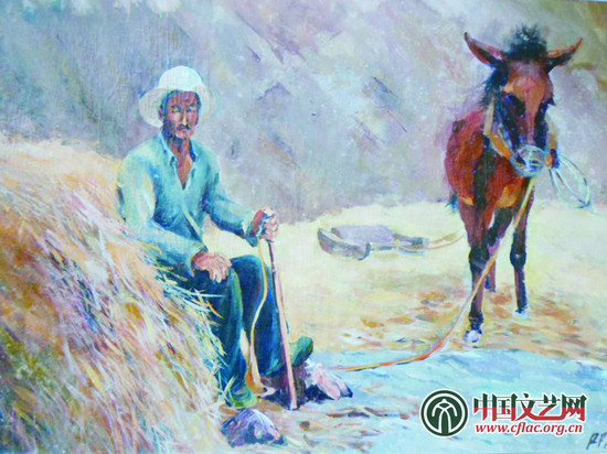 《農忙季節》創作者王銳平系中國文聯武都支教點安化初級中學美術教師。作品描繪的是武都夏收時節,農民們用原始傳統的方式碾收小麥,畫中的勞動者和他的騾子在勞作間隙稍作休息,從農民黝黑、瘦長的臉龐,安靜的表情,反映了當地人的生活不易和勞作繁重。