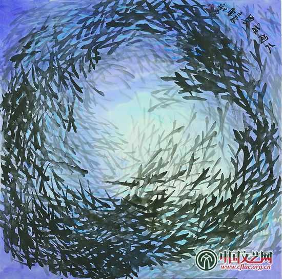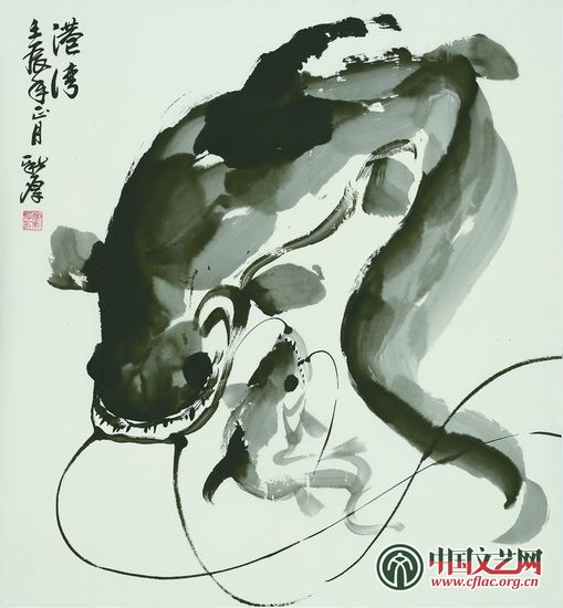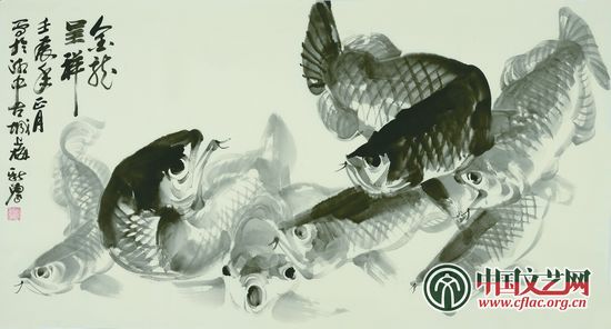 萬(wàn)新厚畫(huà)魚(yú)的所有作品,無(wú)論哪類(lèi)畫(huà)法,無(wú)論哪個(gè)魚(yú)種,在處理手法上他都是“離行而似,貌離神合”、作畫(huà)時(shí)的精神狀態(tài)是“得意而無(wú)形”。對(duì)于一個(gè)有造型能力、有深厚筆墨功底的畫(huà)家,創(chuàng)作時(shí)能否有意的“脫形”、“離形”,是畫(huà)家藝術(shù)品位高低的體現(xiàn),是藝術(shù)創(chuàng)作高境界的追求。運(yùn)筆行墨間須“得意”,得情態(tài)之意、得造化之意、得境界之意,如此出現(xiàn)的作品方能賞心悅目。這樣的創(chuàng)作過(guò)程,這樣的創(chuàng)作思想,這樣的創(chuàng)作狀態(tài),都有獲于“大象”,此乃高境界畫(huà)家藝術(shù)追求之本。