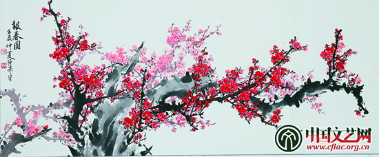 冀聰升的花鳥畫中,多是梅、竹、荷及牡丹,尤以梅最為突出。梅花在他筆下綻放得從容自信,枝干遒勁、傲骨錚錚、花朵絢爛、凌霜傲雪。白底紅梅,素淡中透出熱烈;紅底白梅,平添了幾分雪的圣潔。梅花與雪相遇,實在是性情相似,精神相通,天設之緣,梅花似雪雪似梅,冰清玉潔絕塵俗。多幅梅花圖,有花團簇擁,也有散淡疏朗,形態不同,構圖各異,但精神如一,勃勃生機,躍然紙上。同樣,他筆下的竹,濃淡相間,疏密有致,竹節挺拔,一氣呵成,枝葉通脫,郁郁蔥蔥,精神氣節不言而喻。再看荷花,濃墨重彩,意到墨隨,點染洇暈,有意無意之間,春風化雨,荷花已浮出水面,蘆葦掩映,蜻蜓起舞。如果說冀聰升筆下的牡丹更注重寫實,那么,荷花則更注重寫意,香遠益清之境油然而生。