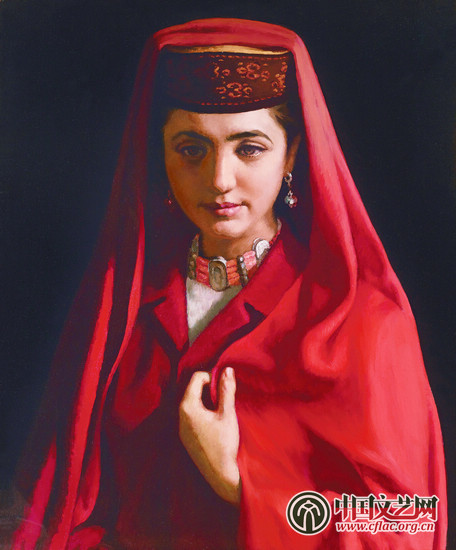 靳尚誼于1983年創作了兩件幾乎完全相同的《塔吉克新娘》,二者只在畫中“新娘”佩戴的項鏈細節上有細微差別。創作較早的一幅作品中,“新娘”佩戴的項鏈上裝飾有三排珠子,此畫完成不久便參加了當年的“中央美術學院教師作品展”,且廣受好評,于同年被中國美術館收藏。第二幅隨后創作,亦完成于1983年。它與中國美術館所藏版本唯一的區別為,“新娘”佩戴的項鏈上嵌有四排珠子。這兩幅《塔吉克新娘》在創作面貌上均十分完美,而同一幅作品的反復創作也足見藝術家對于此作的重視和喜愛。靳尚誼采用側光來捕捉形體結構和色彩的豐富層次,強烈的明暗反差一方面加強了人物體積的充盈之感,一方面也使得畫中人所著的紅色嫁衣漸隱于深色背景,虛實結合中營造出強烈的藝術效果。畫家巧妙運用西方古典主義的寫實手法,用小筆觸細膩地點繪出“塔吉克新娘”豐腴、結實而立體的面部輪廓,并加強了藝術處理的主觀性以突顯畫面的生動。