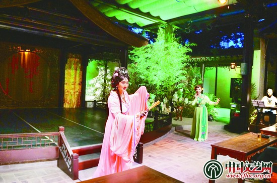 《還魂三疊》是質樸、簡單的,沒有任何舞美設計和麥克音響,但作為駐場演出,需要給觀眾帶來更多視覺和聲場享受。尤其主演《還魂三疊》的三位女演員是有著相當表演資歷水平的一級演員或者教師,《情問三疊》則根據戲園的需要重新招聘年輕戲曲演員長期演出,演員在青春感上勝于前輩,但在演唱、表演上只能盡量亦步亦趨地學習前者,為了增加可看性,在布景、服裝上都做了重新設計,讓舞臺呈現和演員妝容服飾更為亮麗抓人;音響的增加,既彌補了青年演員演唱上的弱項,也使天樂園的戲劇氛圍更為突出。