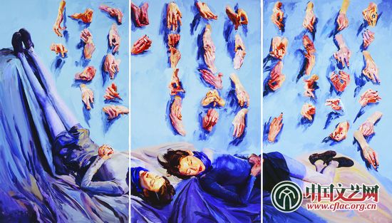 展覽分為兩個部分,展廳入口左側(cè)展出的6幅形式感極強的3聯(lián)繪畫,分別命名為《素手》《深潭》《迷夜》《蚊帳》《記憶盒》及《抽屜》。喻紅說:“繪畫在表述情緒憂郁的時候更為困難,它不像戲劇、文學那么準確、直觀。”喻紅身邊一些情感特別豐富細膩的朋友時常被憂郁的情緒所困,這6幅新作分別以6個人物為主角,從人物對物件及某些習慣的依賴,勾勒出人物的個性與細節(jié),體現(xiàn)出最深切脆弱的情感,幻夢般的構(gòu)圖使作品升華超越情緒與精神本身,呈現(xiàn)出藝術(shù)家更為深刻的人文關(guān)懷。喻紅以獨特的藝術(shù)描繪方式將她身為藝術(shù)家及觀察者在時代變化下的價值思考投射在這6幅畫作上。