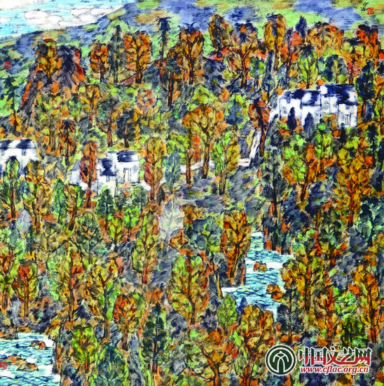 陳向迅,1956年生于浙江杭州。1984年畢業于中國美術學院(原浙江美術學院)中國畫系本科并留校任教;1990年該系山水專業碩士研究生畢業,師承陸儼少先生。現為中國美術學院中國畫系教授、博士生導師。陳向迅的作品重視形式語言的表達,講究筆墨表現的傳統意味,追求厚重而充實、豐富而精致的整體效果和畫面構成。多年來,他始終在思考中國畫該怎樣不失傳統、又與當代接軌。雖然其每一次創作探索,會引起一些爭議,但他堅持求“變”,在當代水墨表現語言實驗和變革方面的探索,是較為成功的一位。在展覽中可以看到陳向迅作品的一大特色:從重彩寫意的五光十色,到水墨語言的深沉厚重。從他本科畢業創作用丙烯黑色替代了傳統的墨,到《課徒》系列嘗試不同的黑顏料作畫,不斷試驗傳統中國畫顏料如何與其他不同性質顏料結合使用。他的畫中,色與墨融合多變,常用豐富的小色塊筆觸代替平涂的大色塊,讓設色不流于簡單的渲染,講究水墨設色的完整精致。在他看來,中國畫設色是對筆墨層次的一種色調補充,而不僅僅是追求色彩自身各種對比關系的表現。重要的是,中國畫設色在于心境和意境的創造,創作寫意山水畫時,不必太關注真實景物中的光影關系和色彩變化,而是要關注情景交融中的內心感受和傾訴。
