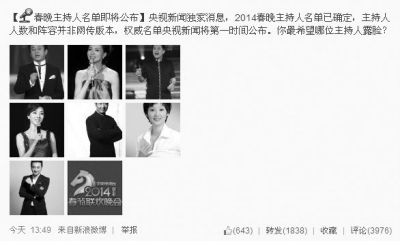 昨天下午,“央視新聞”的官方微博發(fā)消息稱:“2014春晚主持人名單已確定,主持人人數(shù)和陣容并非網(wǎng)傳版本,權(quán)威名單央視新聞將第一時(shí)間公布。”