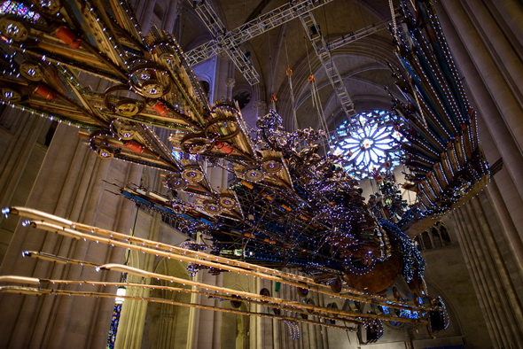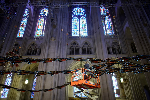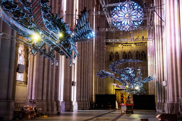 不久前的一個冬日下午,一個八人小組為兩尊鳥兒紀念雕塑完成了最后的修飾工作,它們被懸掛在晨邊高地圣約翰主教座堂(Cathedral Church of St. John the Divine)宏偉的正廳之中。這兩只鳳凰在距離地面20英尺(約合6米)的上空盤旋,閃爍的小燈泡照亮雕塑各種奇異的質材:用層次完美的鏟子制成的羽毛;用防風帽制成的羽冠;鳥兒的頭部是用電鉆做的;身體是用其他廢棄的建筑殘骸制成,包括鉗子、鋸、螺絲刀、塑料軟管和鉆頭。