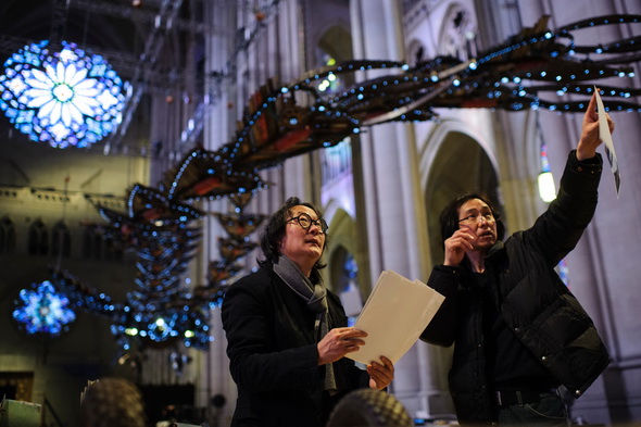 上月月底,九輛平板卡車載著這對鳳凰來到紐約。它們重達12噸,分別長達90英尺和100英尺(約合27.4米和30.4米),動用了30多臺起重機和140英尺(約合42.6米)的捆扎帶,把它們升到高處,使它們顯得仿佛在教堂內飛翔。展出時間約一年。
