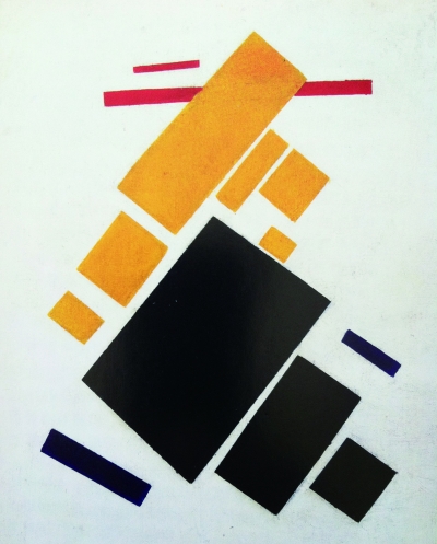 馬列維奇最初醞釀出“至上”的概念時(shí),決意在作品中取消所有對(duì)物質(zhì)世界具體事物的指示和描摹。他為觀眾呈示的是一種全新的圖像語(yǔ)言,并認(rèn)為這種語(yǔ)言包含了“建構(gòu)世界的完整體系”。馬列維奇的至上派作品在圣彼得堡的“0.10:最后的未來(lái)派”展覽(1915)上首次展出。他的參展畫(huà)作共39幅,《至上派構(gòu)圖:飛機(jī)飛行》便是其中之一。正方形、長(zhǎng)方形和線條共13個(gè)構(gòu)成圖形,分別為紅、黃、黑和藍(lán)色,被精心地配置在一片白色背景上。這些圖形看上去或上升或下降,也會(huì)暫時(shí)地靜止穩(wěn)定一下,但穩(wěn)定只是為了再次上升和下降。畫(huà)面?zhèn)鬟f了一種流動(dòng)變化狀態(tài)。馬列維奇解釋道:“我的新畫(huà)作并不僅僅屬于地球。地球已經(jīng)被捐棄,就像人們棄置一棟房屋。地球已經(jīng)被摧毀。”正是這種對(duì)最基本的物理力量——地球重力——的挑戰(zhàn),讓馬列維奇的抽象圖案出現(xiàn)在了一個(gè)精神和心靈的平面上。