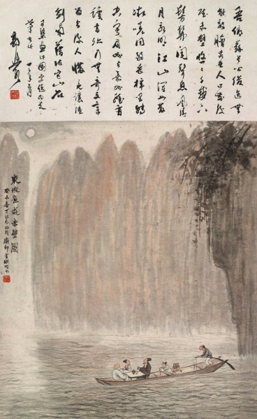 在今年保利香港的拍賣會上,李可染《東坡夜游赤壁圖》是一件值得關注的拍品。《東坡夜游赤壁圖》作于1943年,是可染戰時在大后方重慶的繪畫精品,格調高雅,此時可染尚未成為白石弟子,還保留著他本色繪畫的原汁原味。該圖最能打動人心的地方在于畫面的寧靜致遠,其中洋溢著李可染的天分和才華。上堂由郭沫若題跋,大畫家之丹青與大學者之書法,先似雙峰并峙,又如二水分流。