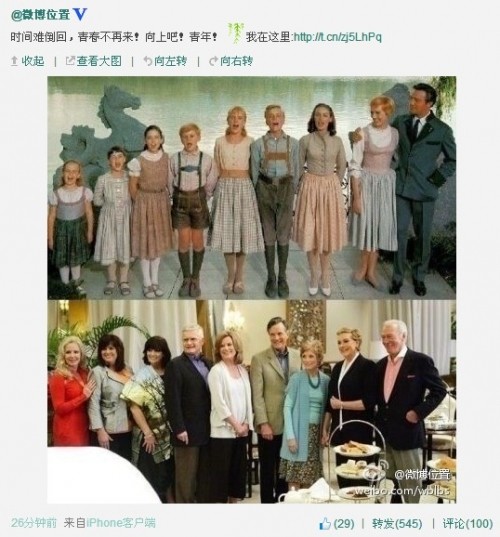 @微博位置今日上午發經典電影《音樂之聲》的劇照配文詮釋青春易逝引發網友熱議,短短半小時內就有近七百條轉發。