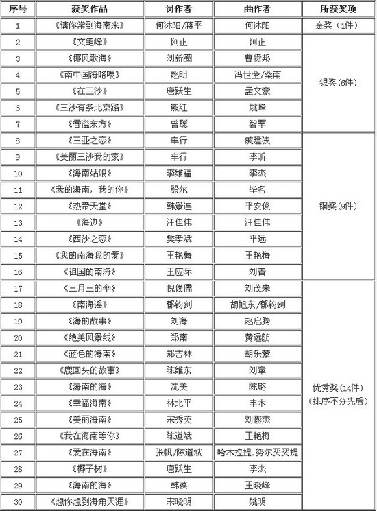 由中國音樂家協會、中共海南省委宣傳部共同主辦,海南省文學藝術界聯合會承辦的“唱響海南”全國歌曲創作征集評選活動,自2012年9月啟動以來,得到了全國廣大詞曲作者的積極響應,共收到應征作品1180件。經評委會嚴格組織初評、復評和終評,最終評選出金獎作品1件,銀獎作品6件,銅獎作品9件,優秀獎作品14件,并將擇時舉辦頒獎活動。現將評選結果公告如下: