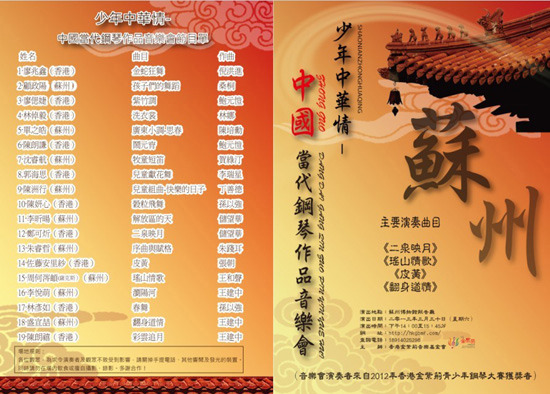 在3月30日當晚蘇州博物館報告廳舉辦的“少年中華情——中國當代鋼琴作品音樂會”中,19位少年鋼琴家出色的演繹了20首具有中國特色的鋼琴作品。其中既有廣為流傳的民歌改編曲目《瀏陽河》、《解放區(qū)的天》、《金蛇狂舞等》……又有具有中國當代特色的現(xiàn)代作品,如:桑桐的《孩子們的舞蹈》、朱踐耳的《序曲與賦格》、張朝的《皮黃》……這些沉淀著中國風格和印跡的鋼琴作品在充滿著時代與文化氣息的博物館響起,更加賦予了音樂會文化的烙印和傳承的使命,首首作品都受到觀眾熱烈的掌聲和贊譽。音樂會的DVD資料也將帶到奧地利國際音樂大師賽暨音樂節(jié)上,讓世界聆聽蘇州和香港的民族之聲。