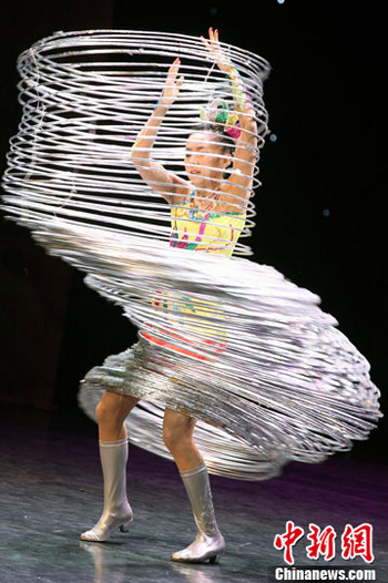 4月14日晚,臺(tái)北孫中山紀(jì)念館大劇場(chǎng),來(lái)自大陸的呼啦圈“小天霸”、吉尼斯世界紀(jì)錄保持者金琳琳表演呼啦圈絕技,技驚全場(chǎng)。中新社發(fā) 董會(huì)峰 攝