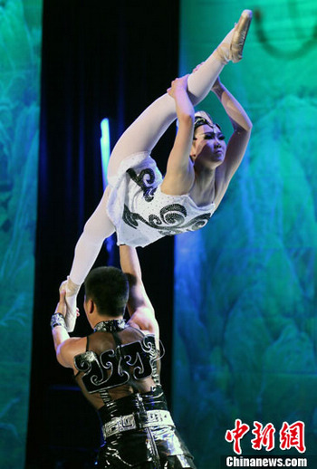 4月14日晚,臺(tái)北“國(guó)父紀(jì)念館”大劇場(chǎng),來(lái)自大陸的孟宛青、袁飛表演雜技《邀月弄影——芭蕾對(duì)手頂》,贏得陣陣喝彩聲。中新社發(fā) 董會(huì)峰 攝