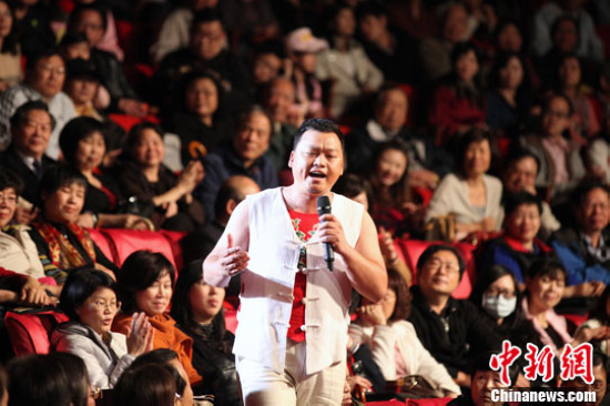 4月14日晚,臺(tái)北“國(guó)父紀(jì)念館”大劇場(chǎng),被譽(yù)為“西部歌王”的大陸著名男高音歌唱家、原生態(tài)歌手高寶利,從觀眾中間唱到臺(tái)上,贏得陣陣掌聲。中新社發(fā) 董會(huì)峰 攝