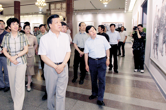 一進展廳,劉云山便認真地觀看展覽作品。從作者、創作風格到繪畫材料,他不時與陪同人員交流。在觀看完所有作品后,劉云山說,西藏地理條件特殊、自然風貌獨特、歷史文化悠久,西藏各民族人民在建設社會主義新西藏過程中,培育和弘揚了“特別能吃苦、特別能戰斗、特別能忍耐、特別能團結、特別能奉獻”的西藏精神。他希望有更多的各門類藝術家走進高原、深入各族群眾,創作出更多反映西藏人民推動科學發展、維護民族團結、促進社會進步的優秀作品。
