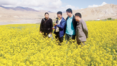 阿里地區(qū)農(nóng)牧局技術(shù)人員調(diào)研科加村青稞、油菜長勢情況 李衛(wèi)寧 攝