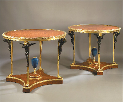 此次拍賣活動的拍品亮點頗多,古董家具方面有多款在法國古董家具歷史上具有代表性的人物弗朗索瓦·林科(Frankgois Linke)的作品,其中一對路易十六風格銅腿紫檀面圓桌(見圖二),簡潔大氣又不失華貴。鐘表拍品中有一件約1865年產(chǎn)自法國的三件式鐘表,均采用鎏金銅內(nèi)填琺瑯的工藝制成,華麗而優(yōu)雅。銀器也是本次拍賣中重要的組成部分,一件銀與玻璃完美結合的維多利亞時期擺件是其中的代表。本次拍賣的版畫作品中有多幅著名畫家的限量珍品。其中,現(xiàn)代藝術之父安迪·沃霍爾1981年在絲網(wǎng)彩印基礎上附鉆石粉工藝所作的《神話 米奇》(見圖一),巴勃羅·畢加索的《四裸女》、《坐著的女人》,馬克·夏加爾的《家庭的丑角》,以及薩爾瓦多·達利9張一組的版畫《風景九幅》等都是難得的藏品。