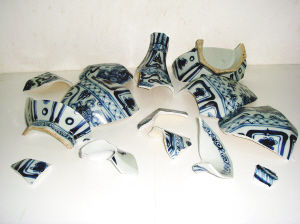 按照《景德鎮陶錄》記載,“其方棱者,用布包泥,以平板拍連成片,裁方粘合。”而這件瓷器也讓蔣先生印證了元青花、方器的制作工藝。數月前,藏家把一堆青花碎瓷片捧到蔣先生面前,從15塊碎片內側,可以看到多處非常清晰的接胎痕跡。蔣道銀先生介紹說“古陶瓷修復分為清洗、黏結、補缺、打底、彩繪、罩光等步驟”。蔣先生首先把碎瓷片放入超聲波容器內清洗,并為每一塊瓷片標上編號,隨后開始由下至上黏接。黏接完成后,用專用填充料填入器身殘缺部位。待補缺部位打磨平整后,就能配色噴釉。元青花的底色是白中帶綠的“蛋殼青”,他采用器械噴繪法,嚴格控制噴繪范圍。