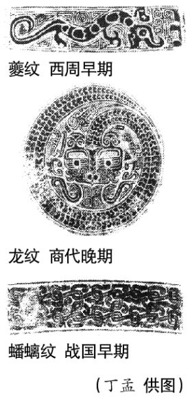 龍紋是在青銅器上流行時間最長的裝飾紋樣之一。龍是古代神話傳說中的動物,是殷人卜問的對象之一。龍的形象起源很早,但作為青銅器紋飾,最早見于商代二里岡時期,以后商代晚期、西周、春秋直至戰國,都有不同形式的龍紋出現。青銅器上的龍紋,一般在反映其正面圖像時,都是以鼻為中線,兩旁置目,體軀向身側面延伸。商代龍紋多表現為卷曲的形態,商末周初的方彝,方鼎口沿處盛行龍頭在中間,分出雙尾,即雙體龍紋,兩周還多表現幾條龍相互盤繞,或頭在中間,分出兩尾。傳說龍的出現與水有關,《考工記·畫繢之事》謂:“水以龍、火以圜。”意思是用龍的形象來象征水神,因此在青銅水器中,龍的圖案和立體形象有更多出現。