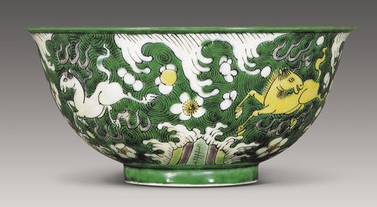 康熙時(shí)期釉上彩瓷器中有一種生產(chǎn)數(shù)量不多,藝術(shù)上文靜典雅的瓷器,叫素三彩。大家熟知康熙五彩絢麗多姿,馳名中外,而素三彩作為康熙的彩瓷之一,雖然用彩方面沒有五彩那么豐富,但它在清朝宮廷用瓷中地位很高,非同凡響,這主要是由于素三彩精細(xì)的工藝和高雅的藝術(shù)品位。什么叫素三彩?明清兩代景德鎮(zhèn)生產(chǎn)的一種釉上低溫彩瓷器,繪瓷的彩料以黃、綠、紫彩為主,還有白彩和墨彩。底色釉有白釉,即“白地三彩”;黃釉,即“黃地三彩”,黑釉,即“黑地三彩”;紫色釉,即“紫地三彩”等等。素三彩瓷要二次燒成,第一次燒素瓷,已成型好的各類器形要用1250℃以上的高溫?zé)桑嫵刹十嬕院笤僖?50℃~950℃的高溫?zé)省K厝室钥滴跤G廠和景德鎮(zhèn)民窯中部分高級(jí)作坊生產(chǎn)的作品最佳。在用彩上,素三彩不用紅彩,故和五彩區(qū)別開來。