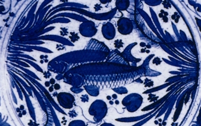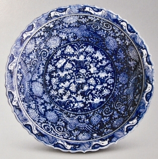 圖1土耳其托普卡比宮藏元青花青地白花蓮池水禽紋菱口大盤