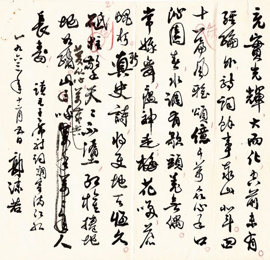 書札的文化內(nèi)涵與多重價(jià)值主要體現(xiàn)在以下幾方面:一是名氣大小,二是內(nèi)容如何,三是書法藝術(shù),四是所用材料,五是品相性狀。我們以1963年郭沫若讀毛主席詩詞《調(diào)寄滿江紅》為例:郭沫若是現(xiàn)代著名書家,書法初學(xué)顏真卿,又參柳公權(quán)、米芾、董其昌、趙孟頫諸家筆意,旁涉甲骨、金文,晚期形成自己風(fēng)貌,人稱“郭體”。其所作行草書,鐵畫銀鉤、長槍大戟、肆意縱橫、自由灑脫,加之深厚修養(yǎng)和淵博知識滋養(yǎng),使他自然成為現(xiàn)代文人書法的代表人物。在文物藝術(shù)品市場上,其作品受到熱烈追逐,價(jià)位一直名列前茅。2011年中國嘉德秋拍,他的七言對聯(lián)錄毛主席詩句“喜看稻菽千重浪,躍上蔥蘢四百旋”以690萬元成交。而《調(diào)寄滿江紅》為創(chuàng)作文詞,內(nèi)涵豐富,既能讓人欣賞他的書法藝術(shù),又能展現(xiàn)他的詩人風(fēng)采。雖然篇幅不長,卻滿紙?jiān)茻煛_€有鉛筆修改字跡,發(fā)表前修改樣稿,與詩刊定稿對照,可以清晰看到如此大家對其作品反復(fù)推敲修改的痕跡和進(jìn)退拿捏的心路歷程。詞中所說讀毛主席詩詞,指的是人民文學(xué)出版社1963年12月版所發(fā)表的毛主席詩詞一組37首,其中最后一首就是毛主席1963年1月9日所作《滿江紅——和郭沫若同志》,而這也是和此前郭沫若的另一首滿江紅“滄海橫流,方顯出英雄本色……”3篇《滿江紅》,用中國古典詩詞的形式,通過唱和,直擊當(dāng)時(shí)國內(nèi)外重大事件,引經(jīng)據(jù)典,比喻夸張,幽默譏諷,表達(dá)了中國領(lǐng)袖的鮮明立場、豪邁信心和革命浪漫主義情懷,充分體現(xiàn)出郭沫若對毛主席的崇拜以及和毛主席的切磋與交往。這組詞稿為歷史名人所作,又記錄了重大歷史事件,書法俊美,詩情激蕩,內(nèi)涵深邃,外延廣闊,既高瞻遠(yuǎn)矚,又趣味盎然,給人諸多美感和無限遐思。