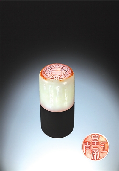 據介紹,清乾隆六十年(1795年)白玉御題詩“太上皇帝”圓璽,是乾隆85歲被尊為太上皇帝時所制,是乾隆二十多方“太上皇帝”御璽中唯一一枚圓形的。這方寶璽曾兩度在香港拍賣,均刷新御制玉璽和白玉拍賣世界紀錄。