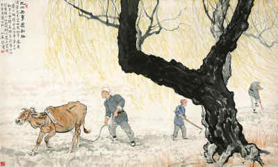 《九州無事樂耕耘》是徐悲鴻于1951年創作并贈送給郭沫若的。此畫不僅是新中國成立后徐悲鴻最大的一幅作品,而且把土地改革、抗美援朝等時政題材寓于其中,有著鮮明的時代印記。