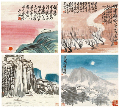 齊白石《山水冊》(局部),作于1931年秋天,共12開。據其中《朝陽》一頁的題跋:“此冊廿又四開”,可推斷目前所見是其中一半,另一半不知去處。冊頁的題材,大體源于白石老人的遠游印象和家鄉記憶,畫法則來自在前人圖式和寫生基礎上的創造。