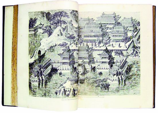 外文書籍中包含了極為豐富的資料信息。1864年巴黎出版的法文版《環(huán)游世界》為一部法國(guó)早期旅游探險(xiǎn)雜志,主要介紹了19世紀(jì)歐洲探險(xiǎn)家游歷世界的見聞,內(nèi)收大量銅版畫,其中包括圓明園全盛時(shí)的景觀、英法聯(lián)軍攻占八里橋等題材。