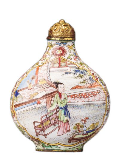 銅胎畫粉彩庭院仕女圖鼻煙壺