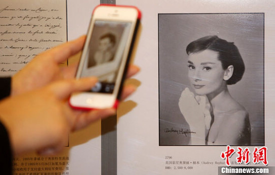 5月14日,觀者在中國嘉德2013春季拍賣油品錢幣預展現場翻拍即將拍賣的拍品――英國影星奧黛麗 赫本親筆簽名照。如今,越來越多的收藏類別走進中國拍賣場,受到收藏者的青睞和追捧。