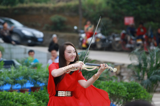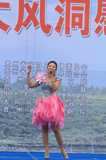 舞蹈《花開中華大家園》拉開了演出的序幕。貴州省歌舞劇院舞蹈團的演員們身著多彩的民族服裝,歡快起舞,展示了我國多民族文化共同繁榮、共同進步的美好景象。貴州省文藝界的各位藝術家紛紛登臺獻藝:具有濃郁民族特色的歌曲《情姐下河洗衣裳》、《家鄉的味道》曲調優美、婉轉悠揚,激昂的小提琴獨奏《拉丁舞曲》令觀眾們熱血沸騰,掀起了演出的高潮。藝術家們精彩演繹的舞蹈《水姑娘》、《鈴鐺舞》將貴州省優美的風光和神秘的民族文化展現在觀眾面前,引來陣陣喝彩歡呼聲。當地正鈺中學的小演員們表演的舞蹈《家鄉的葡萄熟了》和歌曲《風吹葡萄客來香》將原汁原味的苗鄉文化呈現給觀眾們,引得大家紛紛舉起手中的相機、手機留下這動人的場面。本次演出還特別邀請了從大風洞鄉走出去的武術演員王飛鴻參演,他的精彩亮相點燃了觀眾的激情,使得演出的氣氛達到頂點。演出吸引了十里八鄉的村民、學生數千人前來觀看。近一個半小時演出給當地群眾送去了歡笑、送去了精神食糧。觀眾的熱情也讓參演的藝術家們深有感觸:文藝創作根植于火熱的生活,群眾的需要就是藝術創作動力。