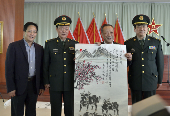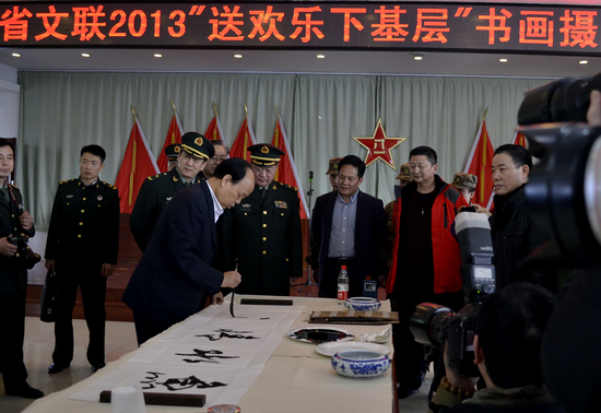 省軍區政治部李競主任主持活動并介紹了來賓,省軍區司令員劉云海少將在歡迎辭上說,省文藝界的各位名家大師,認真貫徹落實黨的十八大關于文化建設“面向基層、服務群眾”精神,到省軍區所屬部隊舉行文化進軍營慰問活動,充分體現了藝術家們高度的責任,強烈的國防意識,濃濃的擁軍情懷。藝術家們時刻關注國防、心系部隊、大力開展文化擁軍活動,全力支持軍旅文藝創作,為發展先進軍事文化、培育當代革命軍人核心價值觀發揮了重要作用。